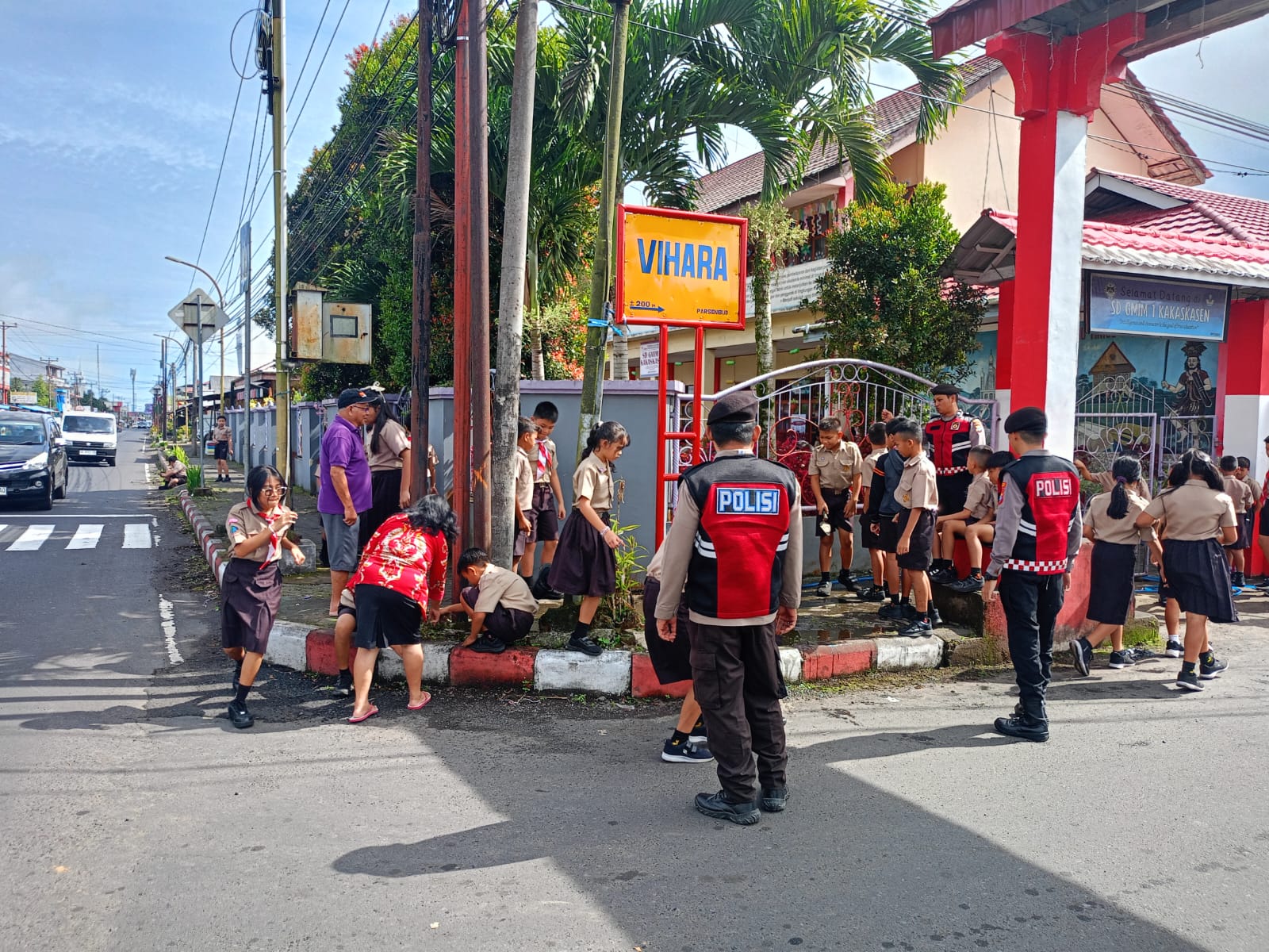 Saat berpatroli, personel mendapati sejumlah siswa-siswi SD GMIM 1 Kakaskasen sedang melaksanakan kegiatan di luar gedung sekolah yang lokasinya berdekatan dengan jalan raya.