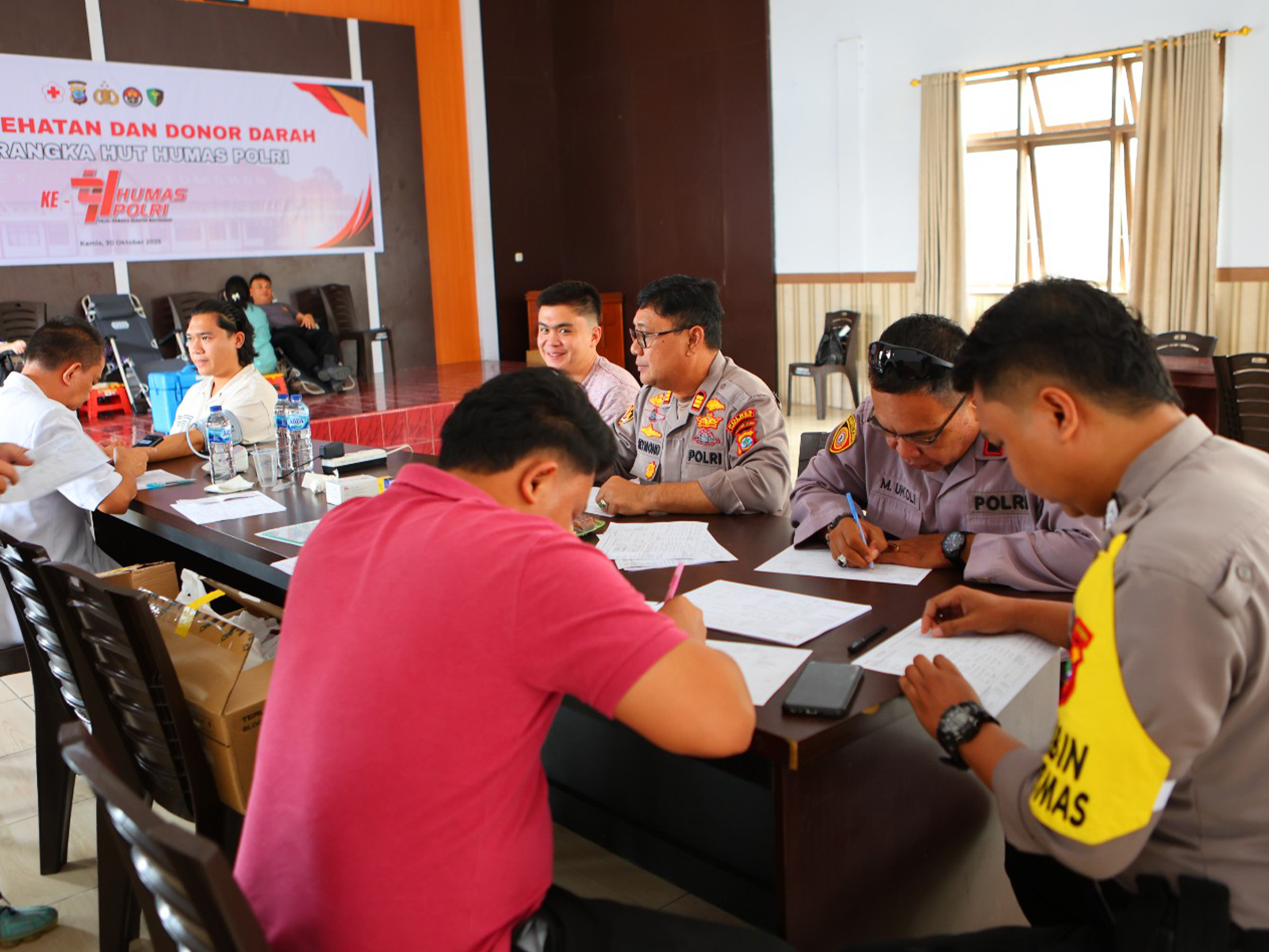 Humas Polres Tomohon – Dalam rangka memperingati Hari Jadi Humas Polri ke-74 tahun 2025, Seksi Humas Polres Tomohon bekerja sama dengan Seksi Dokkes Polres Tomohon dan PMI Kota Tomohon menggelar kegiatan Bakti Kesehatan Donor Darah, bertempat di Aula Parama Satwika Mapolres Tomohon, Kamis (30/10/2025) pukul 09.00 WITA.