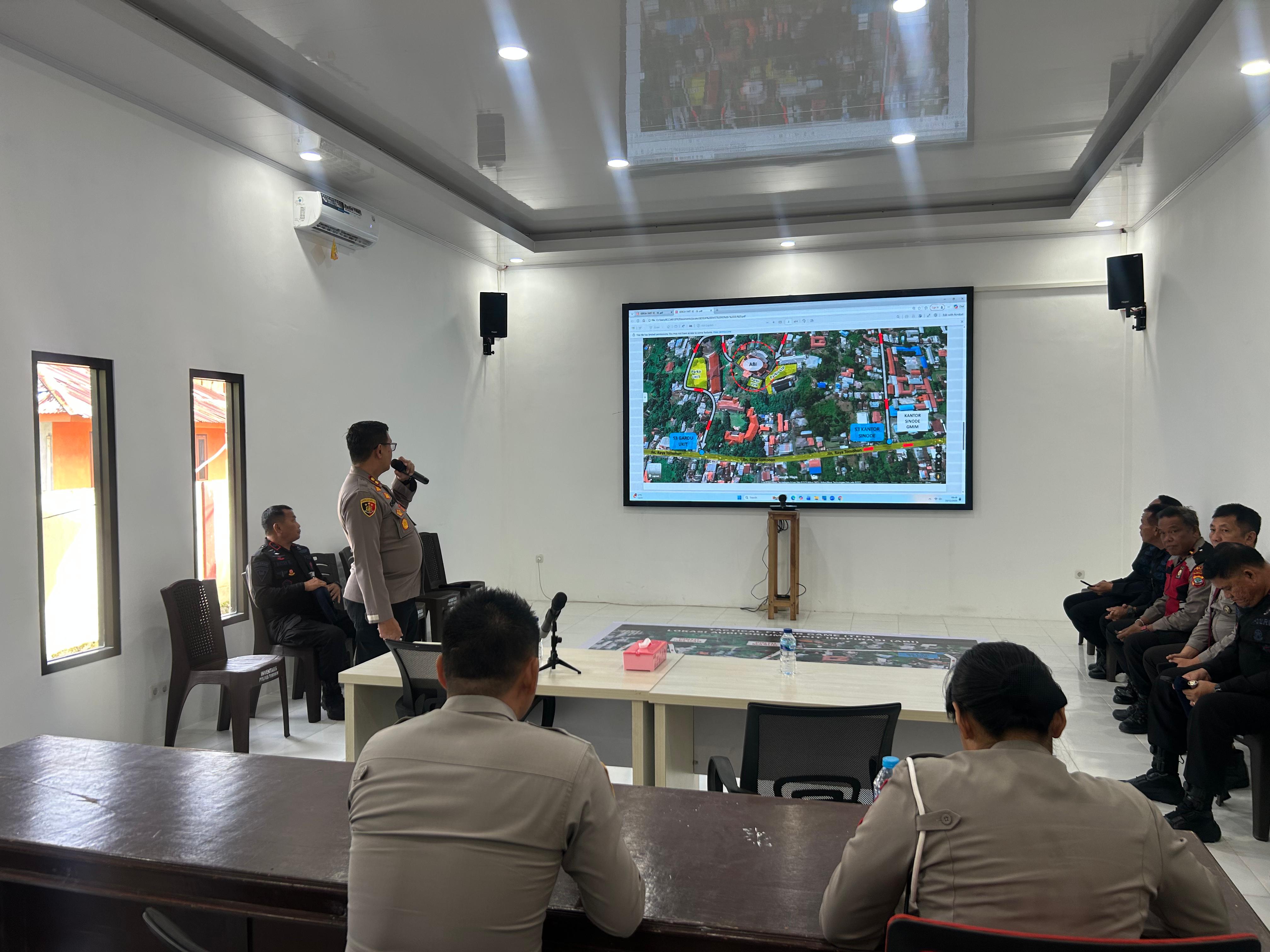 Simulasi Tactical Floor Game dipimpin langsung oleh Kapolres Tomohon AKBP Nur Kholis, S.I.K. Pada kesempatan tersebut, Kapolres Tomohon memaparkan secara detail pola pengamanan, taktik, penempatan personel, serta mekanisme kerja personel di lapangan dalam menghadapi berbagai potensi situasi selama pelaksanaan sidang berlangsung.