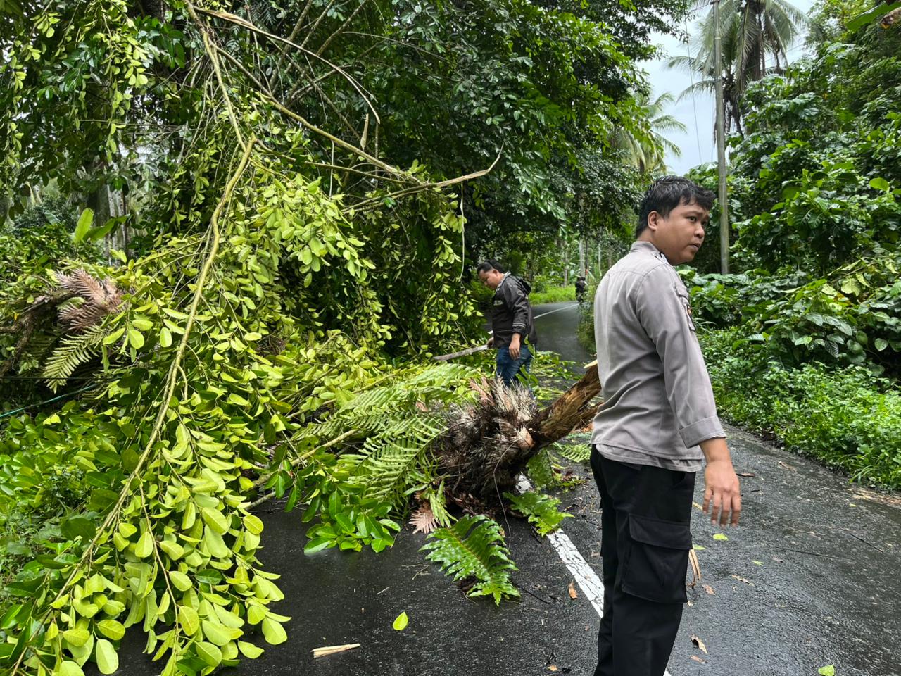 Setelah menerima laporan dari masyarakat, personel piket Polsek Tombariri langsung menuju lokasi kejadian. Di lokasi, ditemukan sebuah pohon tumbang yang menutup satu badan jalan dan berpotensi membahayakan keselamatan pengguna jalan serta menghambat arus lalu lintas.